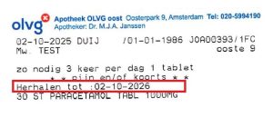 Op dit etiket staat dat u kunt herhalen tot 2 okt 2026. U kunt dit direct aanvragen bij de apotheek.