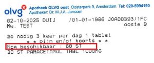 Op dit etiket staat dat er nog 60 stuks herhaald kunnen worden. U kunt dit direct aanvragen bij de apotheek.
