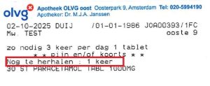 Op dit etiket staat dat er nog 1 herhaling mogelijk is. U kunt dit direct aanvragen bij de apotheek.
